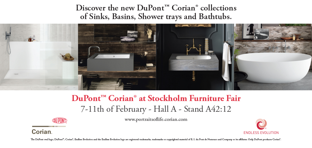 In its stand (Hall A, Stand A42:12) at Stockholm Furniture & Light Fair 2017 (Feb. 7-11, Stockholm, Sweden), Corian® will display its renewed and expanded offering for residential and commercial kitchen and bathroom environments, and ranges of fascinating colours made with unique manufacturing technologies.